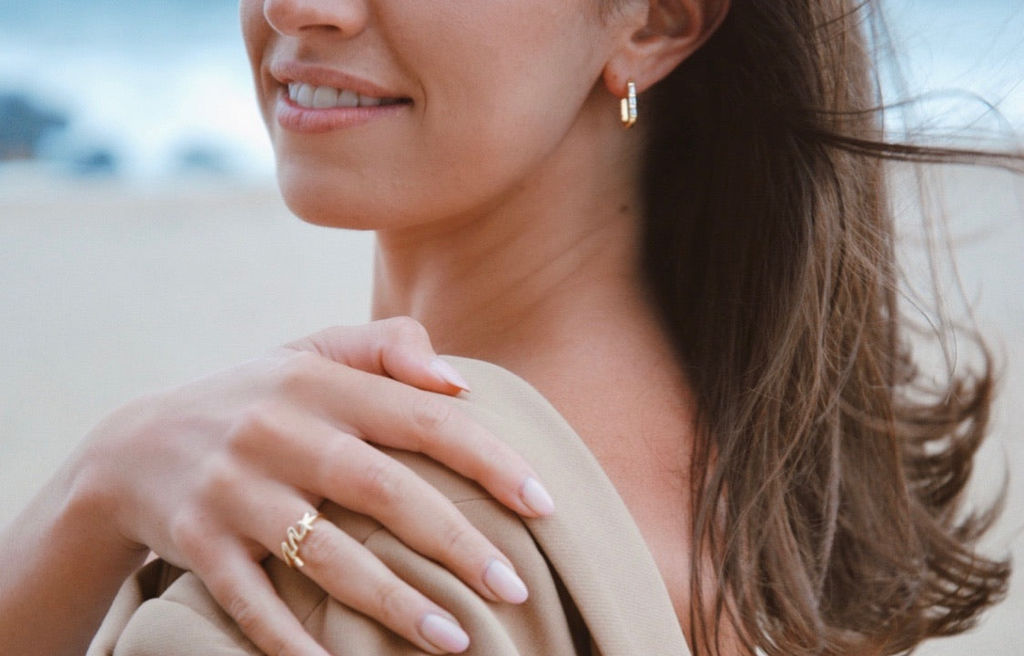 Unlike regular gold plating, vermeil is a much thicker layer of gold which gives the pieces their long lasting color. For a piece to be considered vermeil, the gold must be a minimum of 10k and 1.5 microns. We use either 14k or 18k gold and a 2.5 micron thick plating. In short, yellow vermeil isn't your average plating- it's thicker to accommodate your active lifestyle.