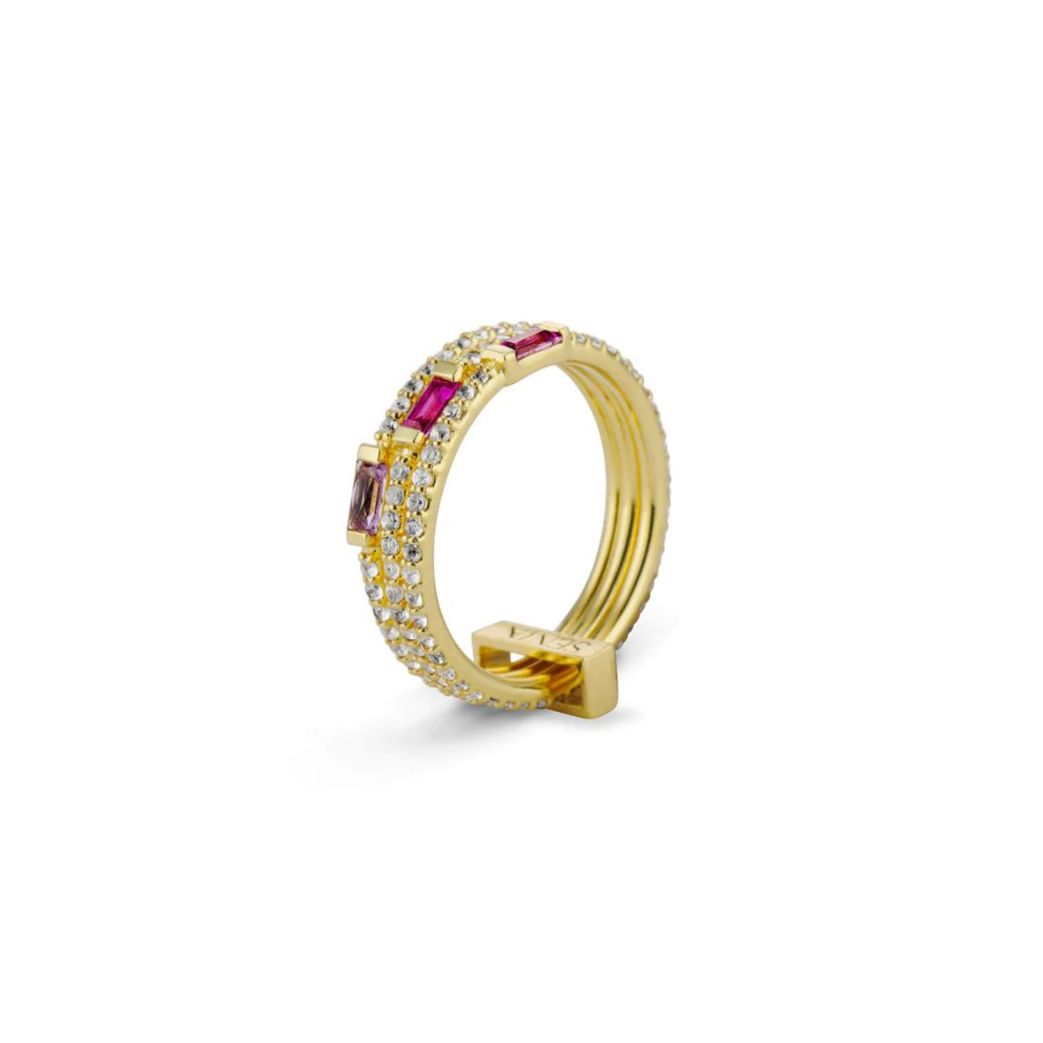 From birthdates to anniversary months, customize this fine jewelry stack for the finest of life's moments. Stack your story with our Birthstone Rings! This triple band set is adorned with white topaz and custom-cut colored baguettes to represent the most special months and colors in your life. Engrave the back bar with something sweet to commemorate. Please note your gemstone colors and engraving in the field at checkout.