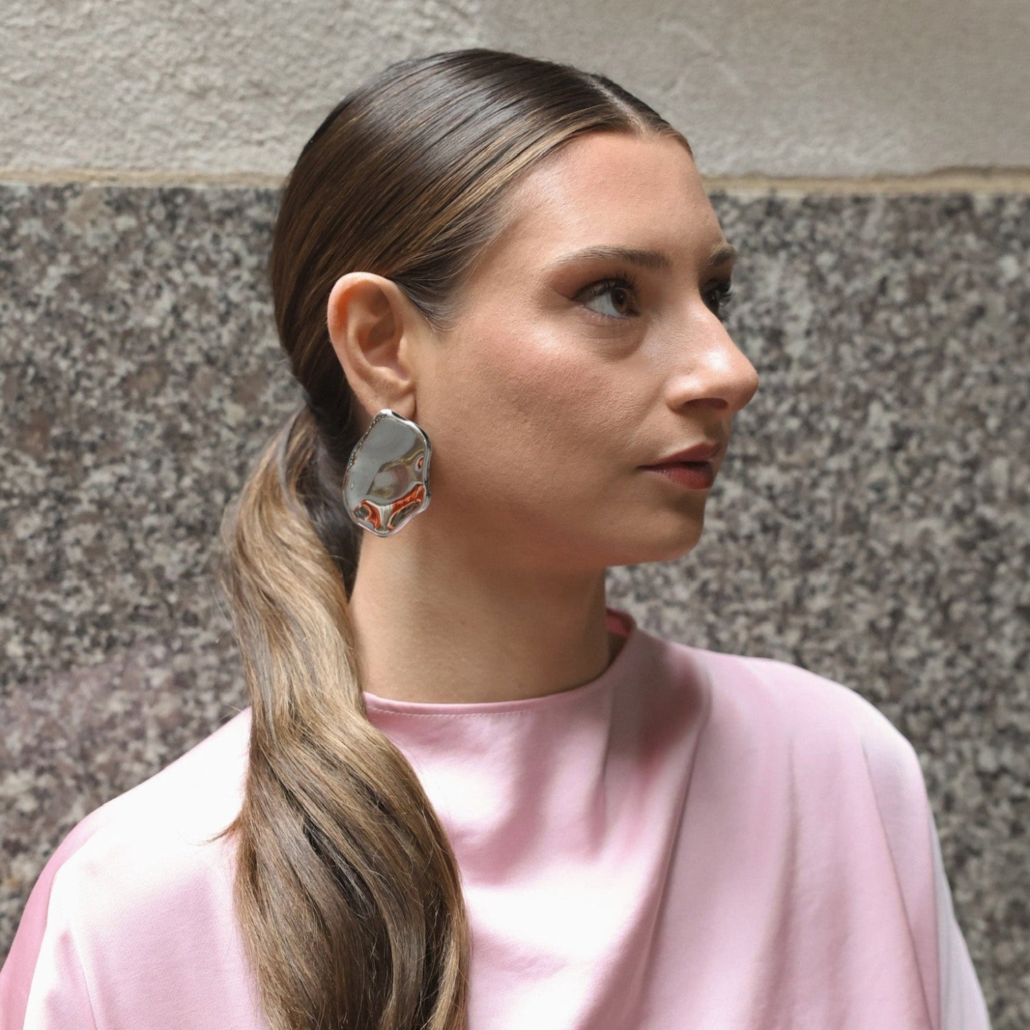 These oversized statement earrings in silver and are designed to reflect and elevate your everyday. Dare to take a dip in our new stainless steel, tarnish & fade-free jewel collection.