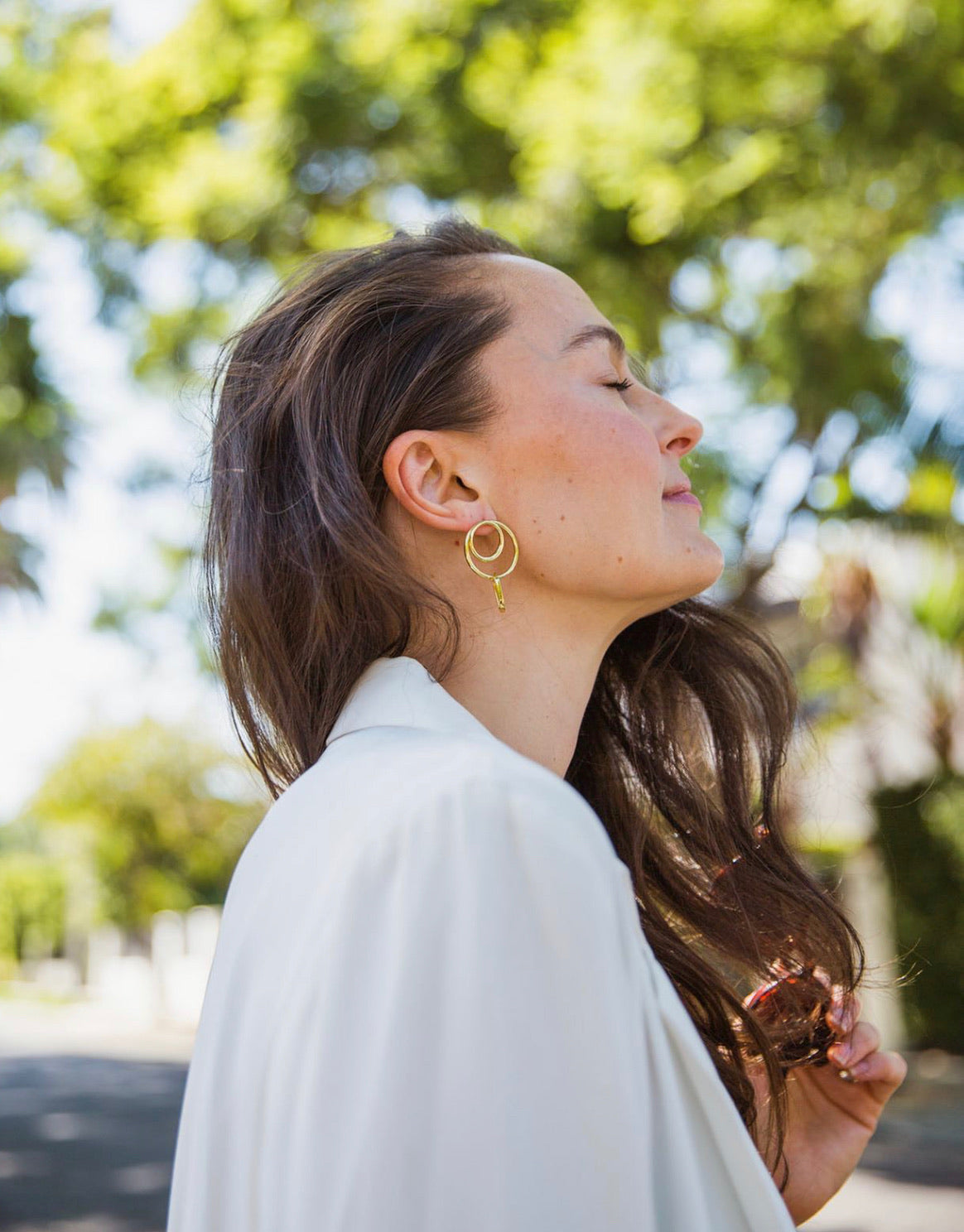 Elevated, edgy, feminine - Estel. The Estel earrings will enhance any day to night outfit so you can make a splash this summer. This set is carefully crafted with baroque pearls, organic gold shapes, and a classic Senia chain drape.