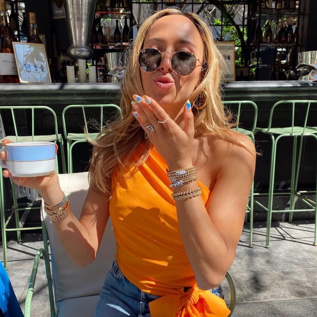 Unlike regular gold plating, vermeil is a much thicker layer of gold which gives the pieces their long lasting color. For a piece to be considered vermeil, the gold must be a minimum of 10k and 1.5 microns. We use either 14k or 18k gold and a 2.5 micron thick plating. In short, yellow vermeil isn't your average plating- it's thicker to accommodate your active lifestyle.