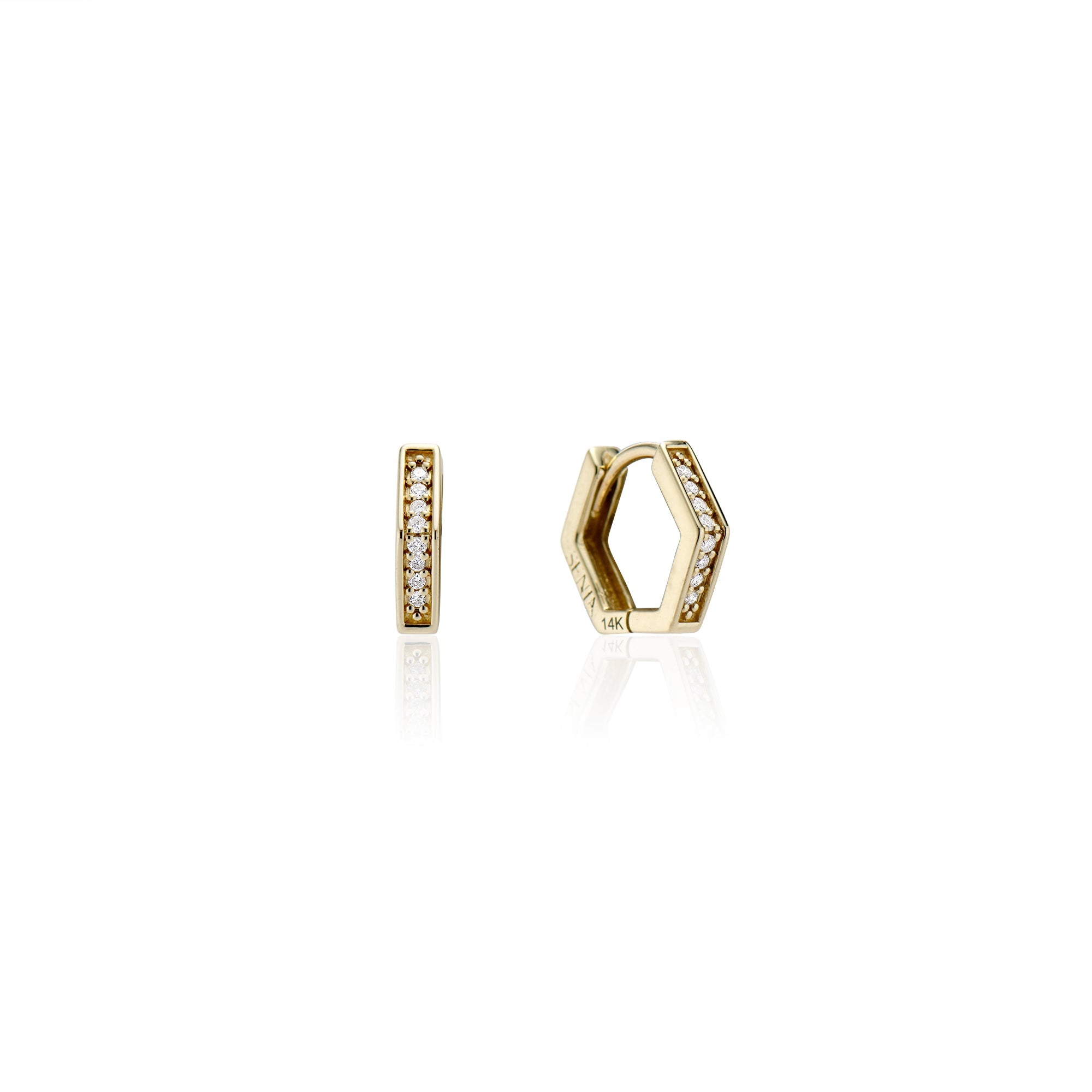 This pair is a playful take on the classic huggie. Hexagonal edges adorned with gems make for a subtle statement.